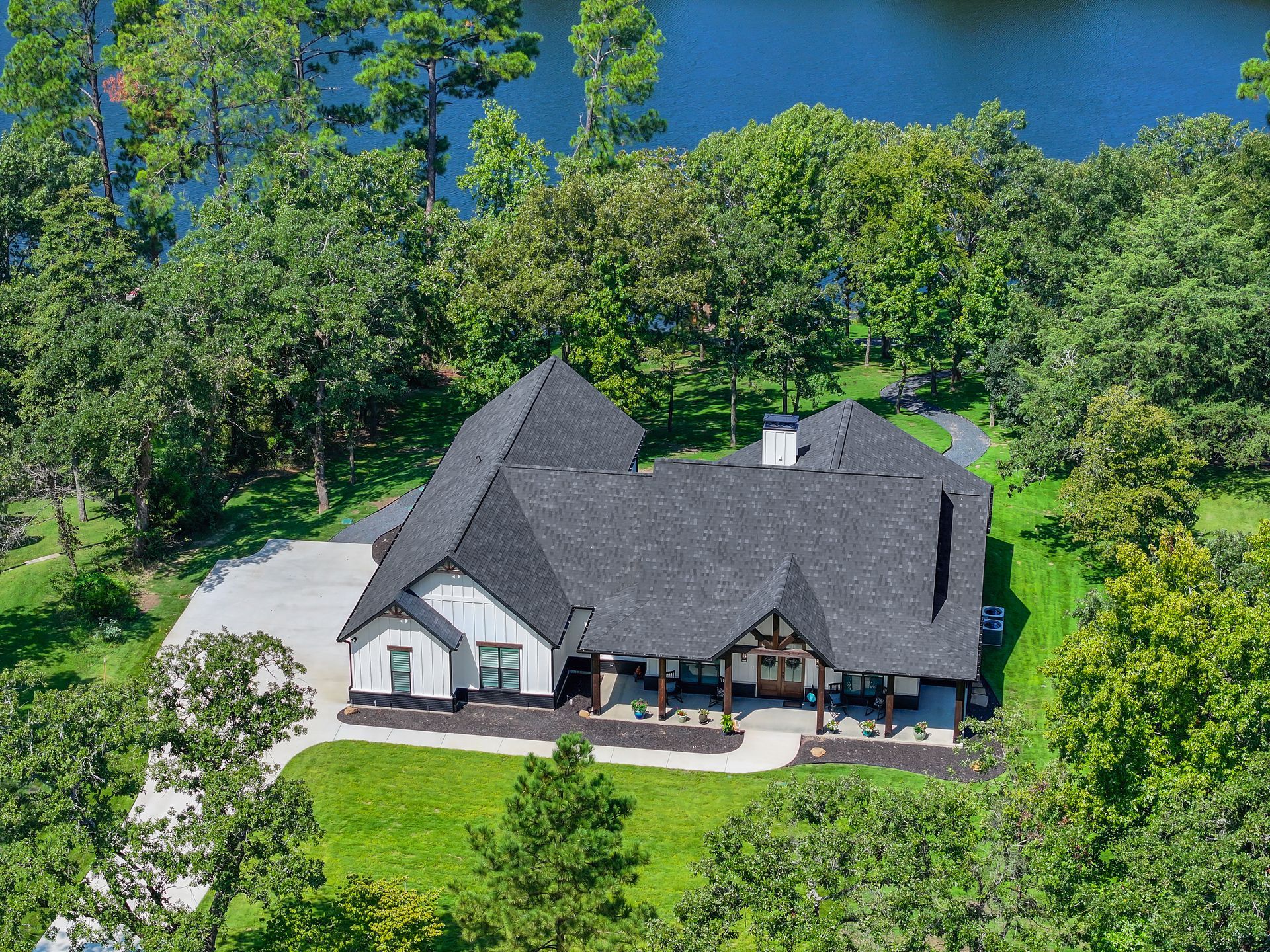 • A house with a walkway leading to it is surrounded by trees and grass.